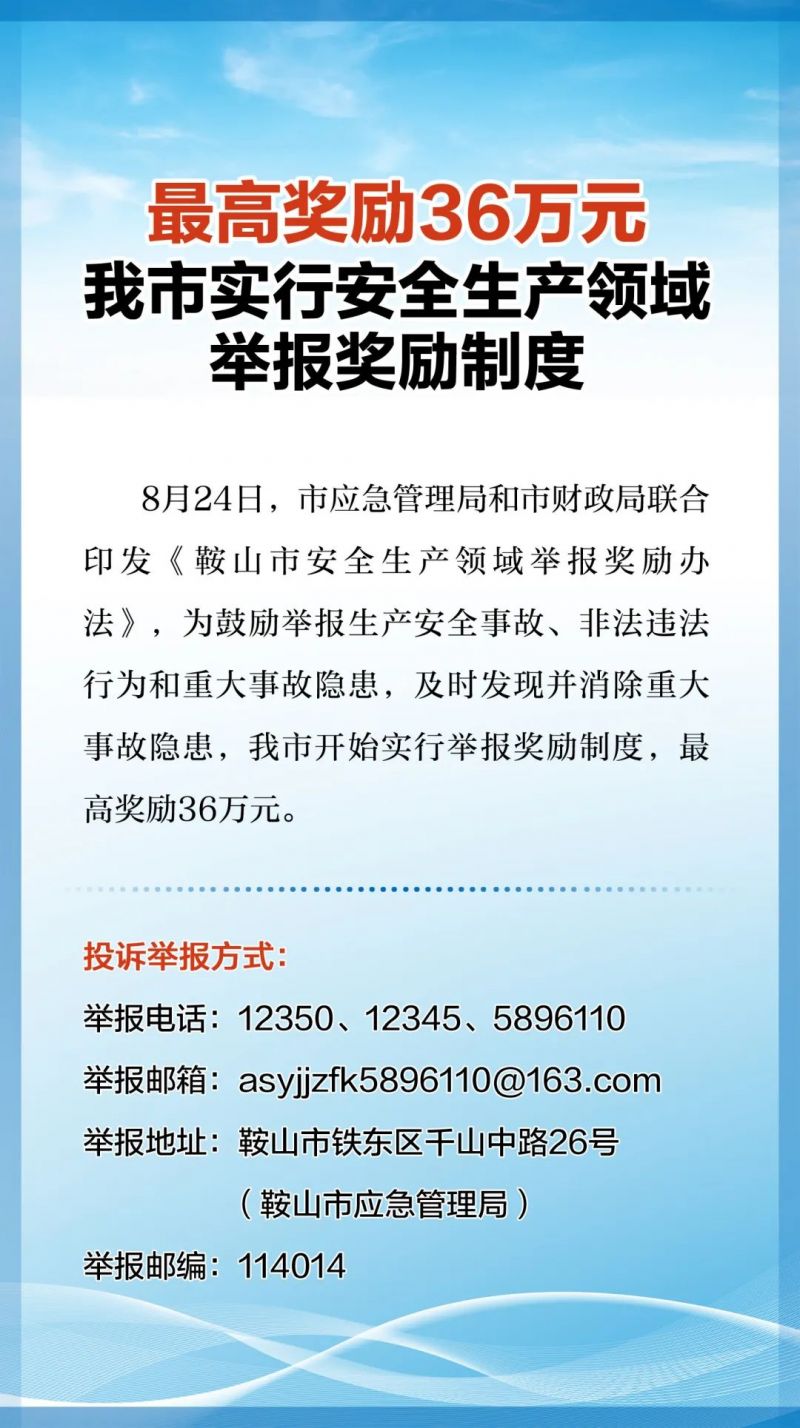 8月24日,市应急管理局和市财政局联合印发《鞍山市安全生产领域举报奖励办法》,为鼓励举报生产安全事故、非法违法行为和重大事故隐患,及时发现并消除重大事故隐患,我市开始实行举报奖励制度,最高奖励36万元。