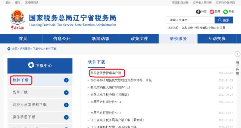 第一步,登录辽宁省税务局官网,进入下载中心--软件下载,下载社保费客户端并进行安装。