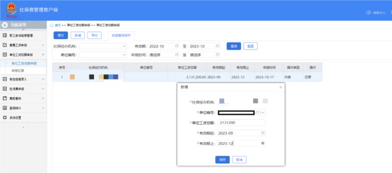 点击【新增】,在弹出的信息框中选择填入社保经办机构、单位编号、单位工资总额、有效期起止。确认信息无误后,点击保存。其中单位工资总额具体为上年月平均工资总额还是上月工资总额,需根据当地医保政策执行。