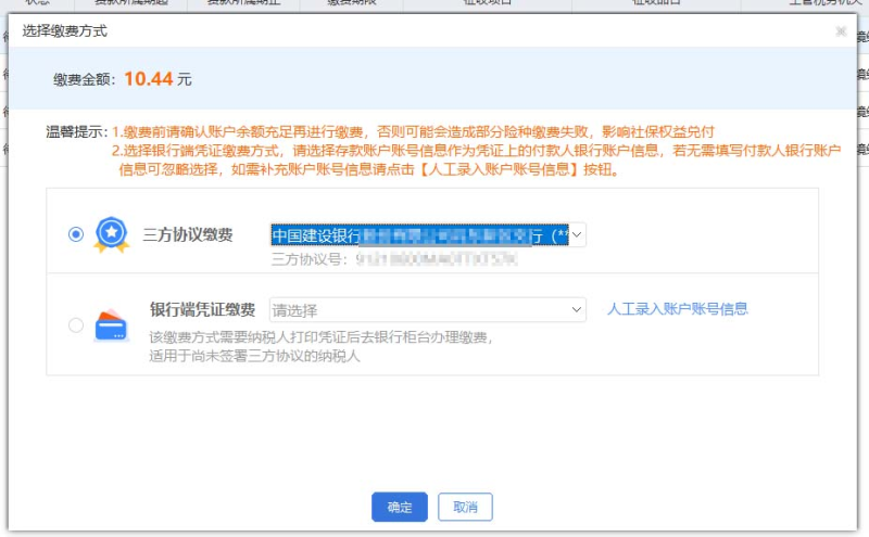 (四)【费款缴纳】点击【缴费】,确认相关信息后,再次输入申报密码,进入“选择缴费方式”界面,以“三方协议缴费”为例,下拉选择三方协议信息,点击确定,依次完成缴费。
